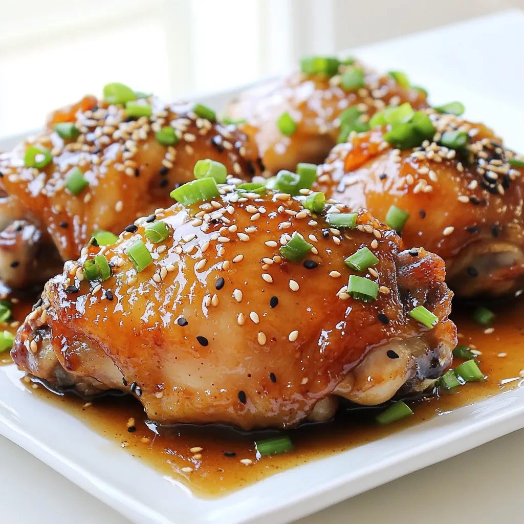 Serve the chicken thighs garnished with chopped green onions and additional sesame seeds if desired.
