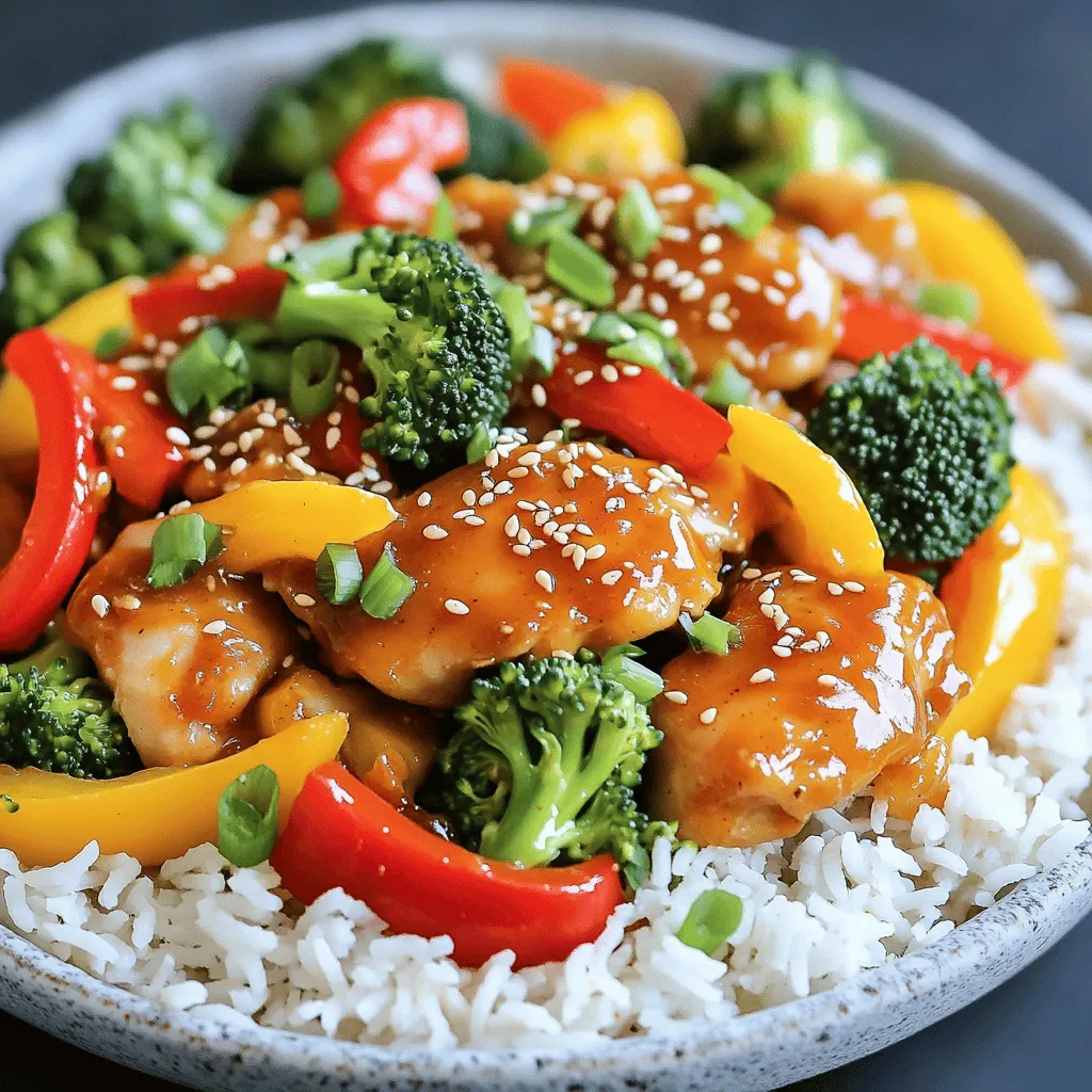 Each ingredient plays a key role in making this dish truly delightful. The chicken thighs provide a juicy base, while sweet chili sauce adds that perfect touch of sweetness. Soy sauce brings in saltiness that balances the flavors. The bell peppers and broccoli not only add color but also crunch. Garlic and ginger bring warmth and depth. Rice vinegar helps brighten the dish, while cornstarch thickens the sauce for a nice coating. Finish it off with jasmine rice for a filling meal and add sesame seeds and green onions for a lovely presentation.