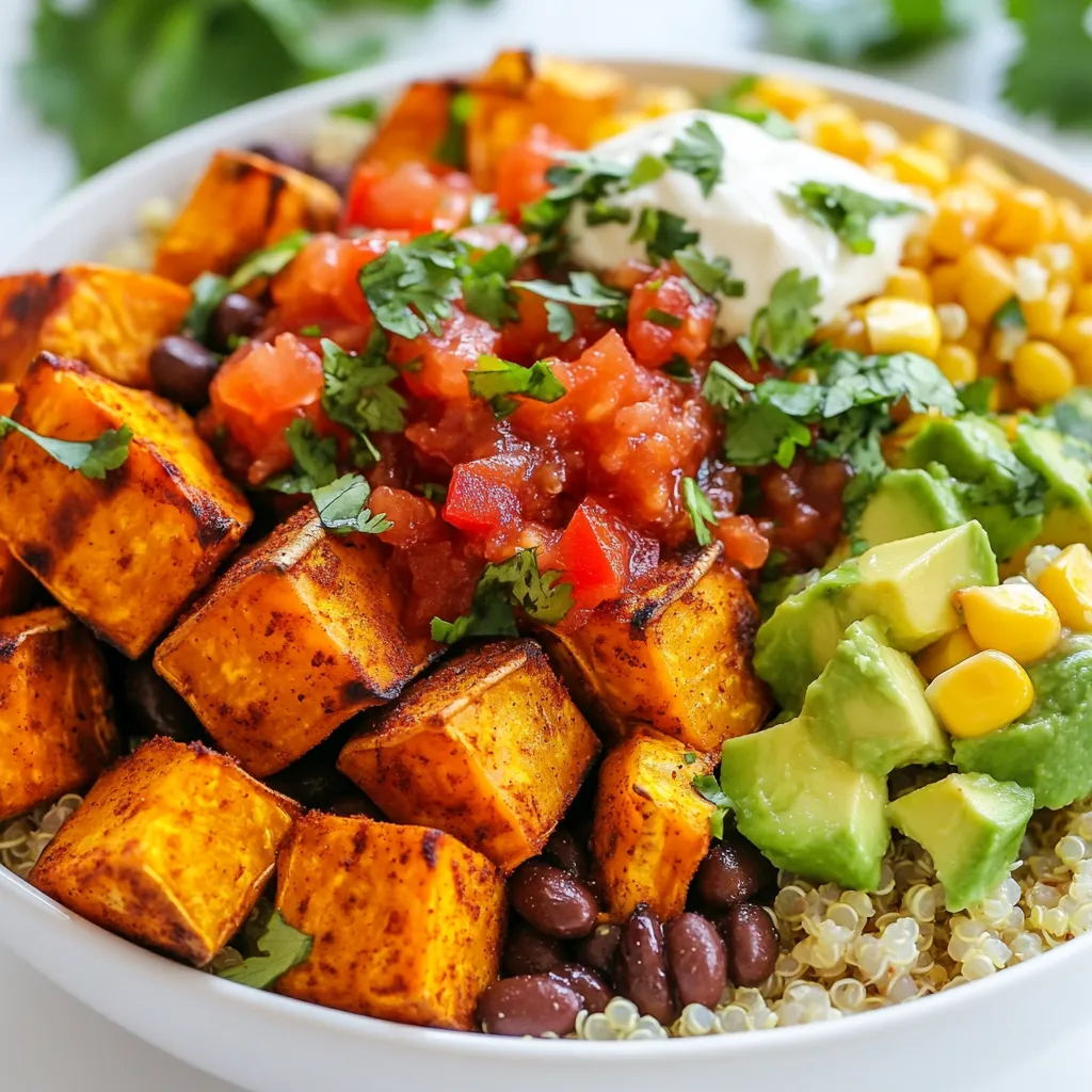 Once the sweet potatoes are done, it’s time to put your taco bowls together. If you want a heartier meal, start with a base of one cup of cooked quinoa or brown rice. Next, layer the roasted sweet potatoes on top. Add the warm black beans and corn mixture. Don’t forget to include the diced red bell pepper, which you can marinate in lime juice for a few minutes. Finally, add diced avocado for creaminess. Top it all off with fresh cilantro, salsa or pico de gallo. If you like, sprinkle crumbled feta or queso fresco on top. Enjoy your colorful and tasty taco bowls!