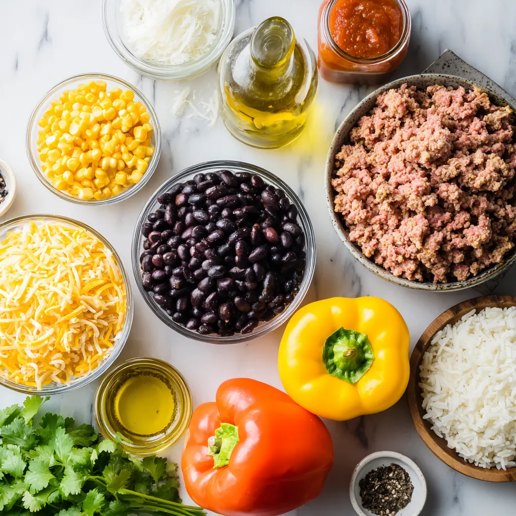 These ingredients blend to create a tasty meal. The bell peppers act as a healthy vessel for the filling. The ground turkey or beef adds protein and flavor. Cooked rice makes the dish hearty. Black beans and corn contribute fiber and texture. Taco seasoning gives the mixture a spicy kick. Salsa adds moisture and zest. Shredded cheese makes everything better with its gooey goodness.