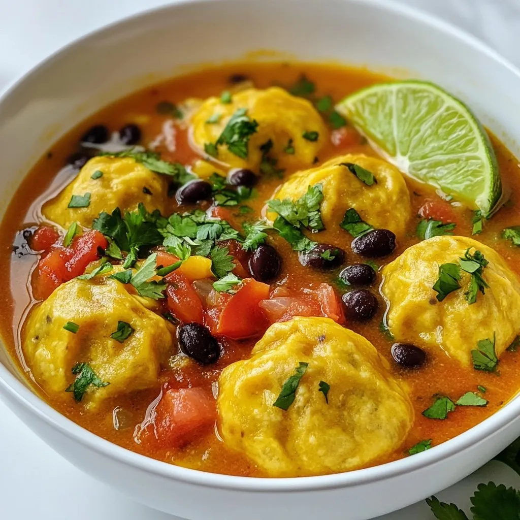 To make Tamale Dumpling Soup, gather these main items: - 1 tablespoon olive oil - 1 small onion, diced - 2 cloves garlic, minced - 1 jalapeño, seeded and diced - 4 cups vegetable broth - 1 can (15 oz) black beans, rinsed and drained - 1 can (14.5 oz) diced tomatoes with green chilies - 1 teaspoon cumin - 1 teaspoon smoked paprika - Salt and pepper to taste - 1 cup masa harina (corn flour) - 1/2 teaspoon baking powder - 1/3 cup vegetable shortening - 3/4 cup vegetable broth (for dumplings) - Fresh cilantro, chopped (for garnish) - Lime wedges (for serving) You can make the soup even better with these toppings: - Fresh cilantro, chopped - Lime wedges - Sliced avocado - Crumbled queso fresco - Sour cream If you can't find some ingredients, try these swaps: - Use canola oil instead of olive oil. - Swap black beans with pinto beans or kidney beans. - Replace masa harina with cornmeal or all-purpose flour for a different texture. - Use vegetable broth with chicken broth for added flavor. - If you want spice, add another jalapeño or some cayenne pepper. These choices keep your soup tasty without losing its heartiness. Enjoy your cooking adventure! {{ingredient_image_1}} Start by heating the olive oil in a large pot over medium heat. Add the diced onion and sauté it for 3 to 4 minutes. You want the onion to turn translucent. Next, stir in the minced garlic and diced jalapeño. Cook them for 1 to 2 minutes until you smell the lovely aroma. Now, pour in the vegetable broth. Add the rinsed black beans and the diced tomatoes, including their juices. Season this mixture with cumin, smoked paprika, salt, and pepper. Bring it all to a gentle simmer. Let it cook for 10 to 15 minutes to blend those great flavors. While the soup base simmers, it’s time to prepare the dumplings. In a mixing bowl, combine the masa harina and baking powder. Add the vegetable shortening and mix until it looks crumbly. Gradually pour in the 3/4 cup of vegetable broth. Knead the mix until you have a soft dough. Now, using your hands, roll the dough into small balls, about the size of a golf ball. Once the soup is simmering, carefully drop the dumpling balls into the pot. Cover it and cook for 15 minutes. This will allow the dumplings to cook through. After cooking, taste the soup and adjust the seasoning if needed. Serve the soup hot, garnished with fresh chopped cilantro and lime wedges on the side. This adds a bright touch to each bowl and makes it irresistible! To boost the flavor of your Tamale Dumpling Soup, use fresh ingredients. Start with a good base by sautéing the onion in olive oil. This builds a nice, fragrant foundation. Adding garlic and jalapeño adds depth and heat. Don’t rush this step; let the onion become soft and sweet. Toss in spices like cumin and smoked paprika. They bring warmth and richness to the soup. Taste as you go, and adjust with salt and pepper. For perfect dumplings, use masa harina as your main flour. This gives them a nice, corn flavor. Mix the masa harina with baking powder to help them rise. When adding vegetable shortening, mix until the dough looks crumbly. Gradually add vegetable broth. This helps create a soft, moist dough. Don't over-knead; just enough to combine is best. Roll the dough into golf ball-sized pieces. This helps them cook evenly in the soup. Store leftover soup in an airtight container. It keeps in the fridge for about three days. The dumplings may absorb some broth, so add a splash of broth when reheating. For longer storage, freeze the soup without dumplings. This way, the dumplings stay fresh. Thaw overnight in the fridge before reheating. When ready to eat, cook fresh dumplings in the reheated soup for the best texture. Pro Tips Fresh Ingredients: Using fresh, high-quality ingredients will significantly enhance the flavor of your soup. Opt for fresh herbs and organic vegetables when possible. Adjusting Spice Levels: If you prefer a milder soup, be sure to remove all seeds from the jalapeño and consider using less or omitting it altogether. Dumpling Consistency: Ensure your dumpling dough is soft but not sticky. If it's too dry, add a little more broth; if too wet, sprinkle in a bit more masa harina. Garnish for Flavor: Don't skip the cilantro and lime wedges! They add brightness and balance to the rich flavors of the soup. {{image_2}} You can add protein to your tamale dumpling soup in many ways. Chicken, beef, or shrimp work well. For chicken, use shredded rotisserie chicken. It saves time and adds great flavor. If you prefer beef, ground beef or steak cubes also fit nicely. Just brown the beef before adding it to the soup. For a seafood twist, add tender shrimp. Toss them in during the last few minutes of cooking. They cook quickly and keep their sweet taste. This soup can easily become vegetarian or vegan. Start by swapping the vegetable broth for a homemade version. Use water and add more spices for depth. Instead of adding meat, boost your soup with more beans. Chickpeas or lentils add protein and texture. You can also mix in extra veggies like zucchini or bell peppers. These not only add color but also make the soup more filling. The spice level of your tamale dumpling soup can change its character. For a mild version, skip the jalapeño or use less. You can also remove the seeds for less heat. To keep some flavor, add sweet bell peppers. If you enjoy heat, increase the jalapeño or add diced serrano peppers. You can also sprinkle in cayenne or hot sauce to taste. Just remember to adjust slowly, so you achieve the right heat for you. To keep your tamale dumpling soup fresh, store it in an airtight container. Make sure the soup has cooled down before sealing it. This helps prevent moisture buildup. Place the container in the fridge if you plan to eat it within a few days. It will last for about 3 to 4 days. Always label your container with the date. This way, you know when to use it. When you're ready to enjoy leftovers, take the soup out of the fridge. P
