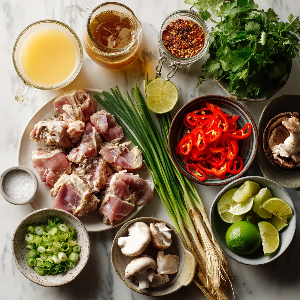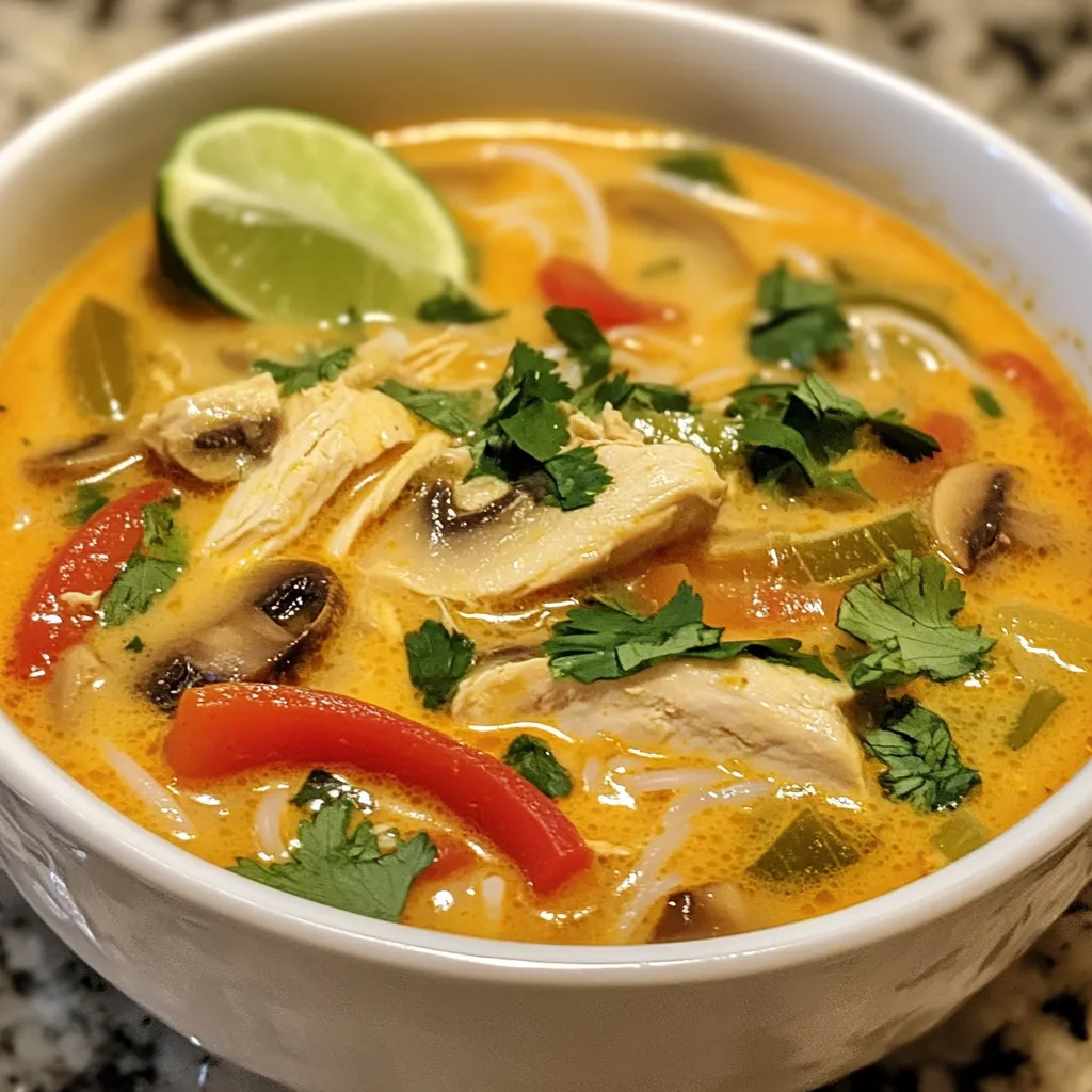 In this soup, the chicken thighs form a tender base. The coconut milk adds a rich creaminess. Chicken broth brings depth to the flavor. For veggies, we use onion, bell pepper, and mushrooms, which add texture and taste. Aromatics like garlic, ginger, and lemongrass give the soup its signature fragrance. The fish sauce and lime juice balance the flavors perfectly. Red chilies add heat, while cilantro and lime wedges provide freshness. Each ingredient works together to create a tasty and comforting dish.