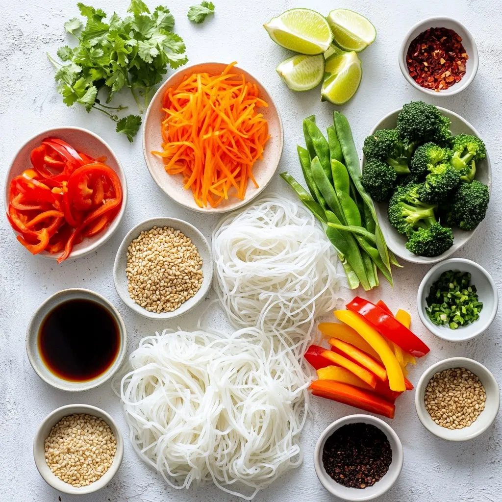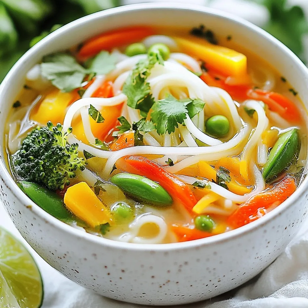 To make a tasty vegetable noodle soup, you need simple, fresh items. Here’s what you will need: - 200g rice noodles - 1 tablespoon sesame oil - 1 medium onion, diced - 2 cloves garlic, minced - 1 carrot, julienned - 1 bell pepper (red or yellow), sliced - 1 cup broccoli florets - 1 cup snap peas - 4 cups vegetable broth - 2 tablespoons soy sauce - 1 tablespoon miso paste (optional for depth) - 1 teaspoon ginger, grated You can add a few extra items to make your soup even better. Here are some great options: - Mushrooms for umami - Spinach for greens - Zucchini for extra crunch - Peas for sweetness - Fresh herbs like basil or mint Garnishes make the soup look and taste great. Here are some fun ideas: - 2 green onions, chopped - Fresh cilantro - Lime wedges for zest These ingredients come together to create a colorful, healthy dish. Enjoy the flavors and colors of your vegetable noodle soup! {{ingredient_image_1}} To start, boil water in a pot. Add the rice noodles and cook them as the package says. This usually takes about 4-6 minutes. When they are soft, drain them in a colander. Rinse them with cold water to stop the cooking. Set them aside for later. Next, grab a large pot and heat sesame oil over medium heat. Add the diced onion and minced garlic. Cook them until the onion looks clear. This should take about 3-4 minutes. The smell will be amazing! Now it’s time to add the fun stuff. Toss in the julienned carrot, sliced bell pepper, broccoli florets, and snap peas. Stir-fry these for about 4-5 minutes. You want them to be crisp but tender. Then, pour in the vegetable broth. Add soy sauce, miso paste, and grated ginger. Mix well and let it simmer gently. Finally, stir in the cooked rice noodles. Heat everything for an extra 2-3 minutes. Taste your soup, and adjust if needed. Don’t forget to garnish with green onions and cilantro before serving! Enjoy the bright flavors! To get the right texture in your soup, cook the rice noodles just right. Follow the package instructions closely. They should be soft but not mushy. Rinse them under cold water after cooking. This stops the cooking process and keeps them firm. When you add them to the soup, they will soak up the flavors without falling apart. To boost the flavor of your soup, consider these tips: - Add a dash of soy sauce for saltiness. - Use fresh ginger for a zing. - Include miso paste for a deeper taste. - Squeeze lime juice just before serving for brightness. - Top with fresh cilantro for a burst of herbiness. These small changes can take your soup from good to great! Want to save time while making your soup? Here are some hacks: - Prep your vegetables in advance. You can cut them the night before. - Use pre-cooked rice noodles if available. This cuts cooking time by half. - Make a big batch of broth ahead of time. Store it in the fridge or freezer. - Use a food processor to chop vegetables quickly. With these tips, you can enjoy a delicious vegetable noodle soup in no time! Pro Tips Use Fresh Vegetables: Fresh vegetables not only enhance the flavor but also add vibrant colors to the soup, making it visually appealing. Customize Your Broth: Feel free to use homemade vegetable broth for a deeper flavor, or add herbs like thyme or basil to elevate the taste. Adjust the Spice Level: If you enjoy a bit of heat, consider adding red pepper flakes or a dash of sriracha to spice things up. Perfect for Meal Prep: This soup stores well in the fridge for up to 3 days, making it ideal for meal prep. Just add the noodles when reheating. {{image_2}} You can easily make this soup vegan. Start with vegetable broth instead of chicken broth. The rice noodles are usually vegan, but check the package. Use soy sauce for added flavor. Miso paste adds a nice depth, too. This soup is packed with veggies, so it’s naturally vegan-friendly. If you need a gluten-free option, stick with rice noodles. They are a great choice! Make sure your soy sauce is gluten-free. You can use tamari instead of soy sauce. This soup stays tasty and safe for those with gluten issues. Feel free to add your favorite vegetables! You can add spinach, zucchini, or mushrooms. Just toss them in when you add the other veggies. For extra crunch, try adding bean sprouts or water chestnuts. This soup is all about your tastes and what you like best. To store leftover soup, let it cool first. Once cooled, pour it into an airtight container. Seal the container tightly. Place the soup in the fridge. It stays fresh for about three days. Reheat the soup on the stove for the best flavor. Pour it into a pot over medium heat. Stir often to heat evenly. You can also use a microwave. Place the soup in a microwave-safe bowl. Heat it in short bursts, stirring in between. Make sure it’s steaming hot before serving. If you want to freeze the soup, use freezer-safe containers. Leave some space at the top for expansion. Label each container with the date. The soup can last up to three months in the freezer. To thaw, move it to the fridge overnight. Reheat it on the stove or in the microwave. Yes, you can use many types of noodles. Rice noodles are light and absorb flavors well. However, you can also use egg noodles, soba noodles, or even zucchini noodles for a low-carb option. Each type will change the texture a bit, but they all work great in soup. If you choose a different noodle, cook it as directed on the package. You can add a variety of vegetables to this soup. Here are some tasty options: - Spinach - Kale - Mushrooms - Corn - Green beans - Cabbage - Peppers Feel free to mix and match based on your taste. The more colors, the better! To add heat to the soup, you have several options. Here are some ideas: - Add sliced jalapeños or red pepper flakes while cooking. - Stir in a splash of sriracha or chili garlic sauce. - Use spicy soy sauce instead of regular soy sauce. Start with a small amount and taste as you go. This way, you can control the heat level. Vegetable noodle soup is easy to make 