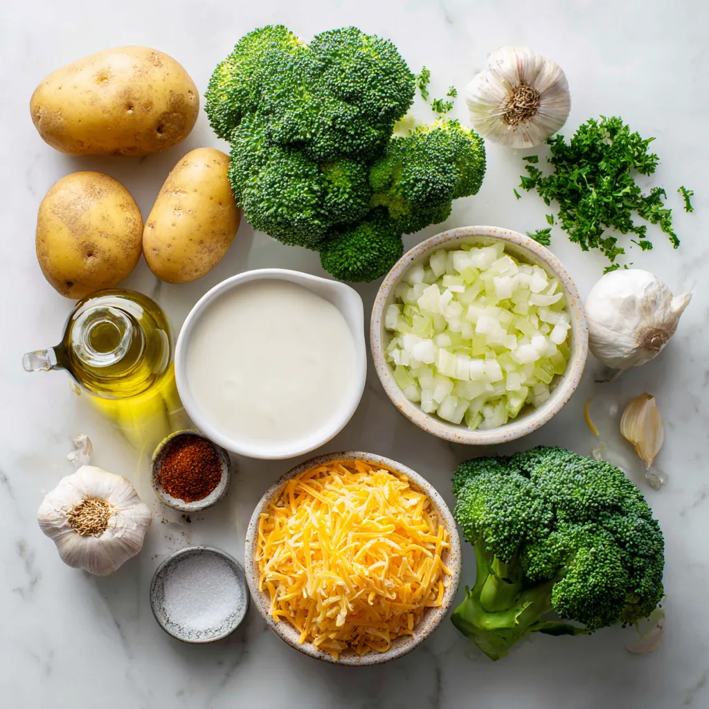 Gathering the right ingredients is key for my velvety broccoli cheddar soup. I love using fresh broccoli florets. They add color and flavor. The onion and garlic create a tasty base. Diced potato makes the soup thick and creamy.